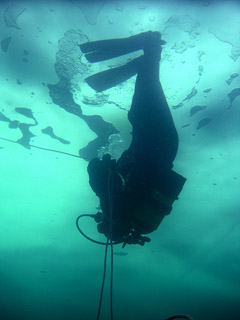 Hauptleine tauchen, Buddyline tauchen, Leine führen, Leinensignale, Notaufstieg an der Leine, Einsteigen und Aussteigen ins Eis waren die Hauptthemen die in den drei Brevetierungstauchgängen abgefragt und geübt wurden. Und zwischendurch hat man auch noch Zeit gefunden die Faszination unter Eis zu genießen.